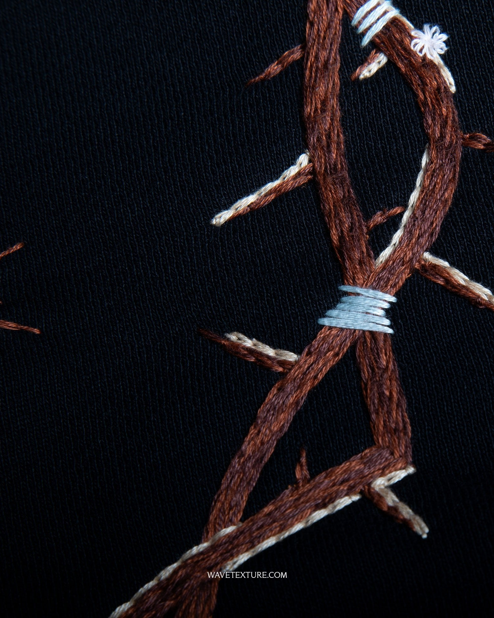 The Roy Veste is marked by an intricate hand-embroidered motif on the hood, developed internally at Wave Texture. Rooted in centuries-old savoir-faire and reimagined through a contemporary lens, the design is the result of over 25 hours of meticulous artisanal work. Coloured threads are blended into detailed, layered forms, adding quiet richness to the garment. Worn down, the hood reads formal; worn up, it becomes a statement. Presented here in the original Sienna colourway, also available in Jade.