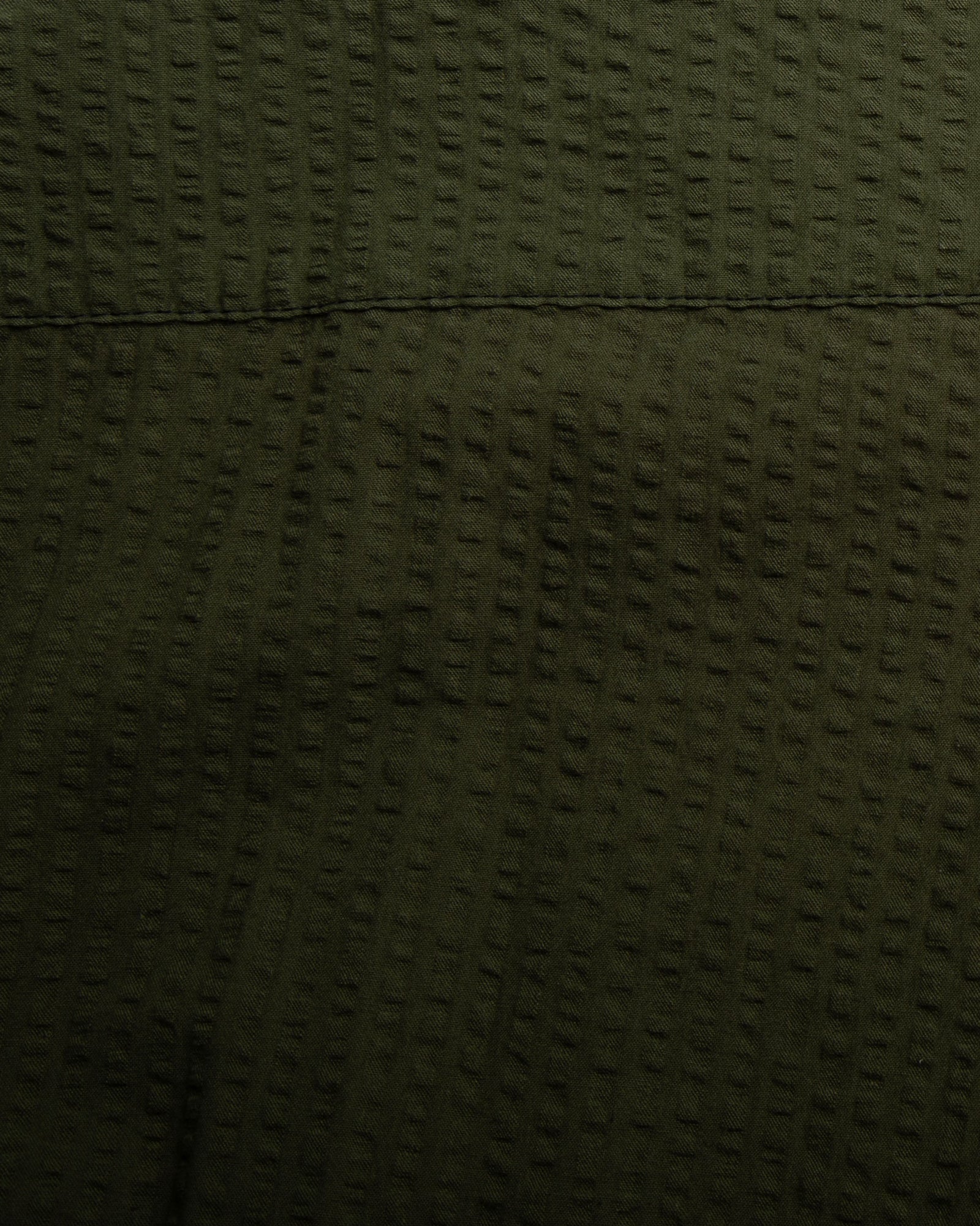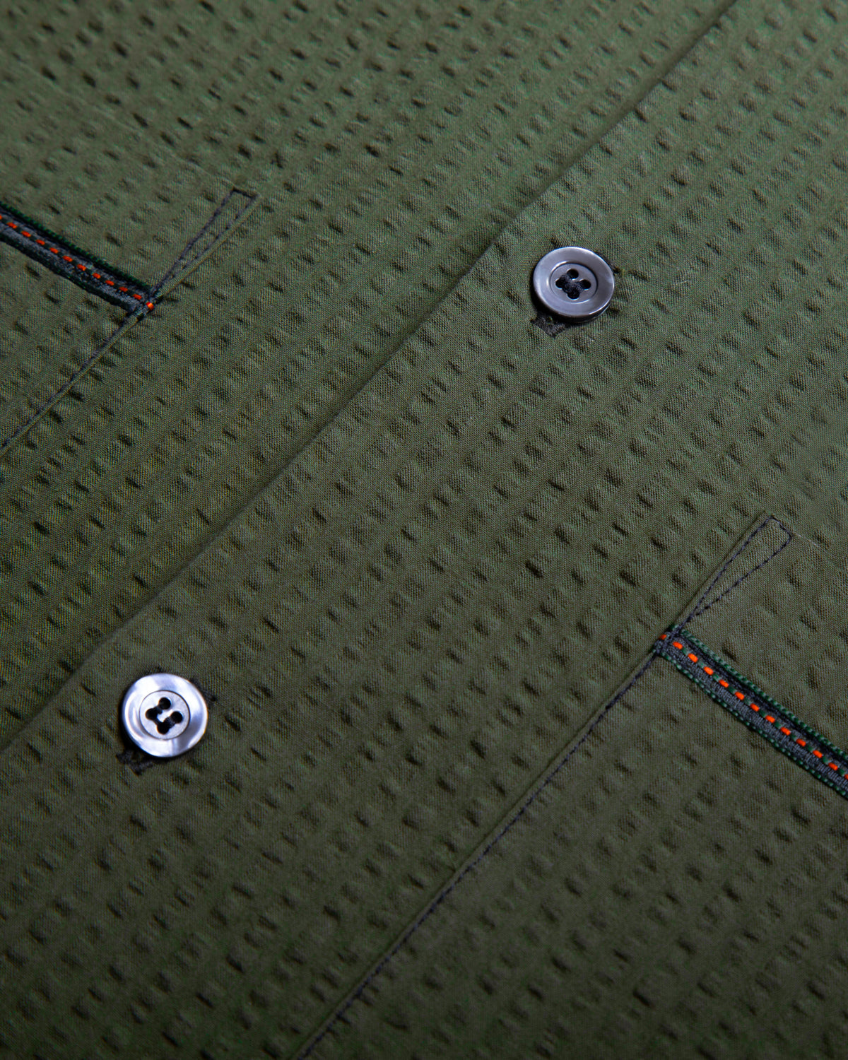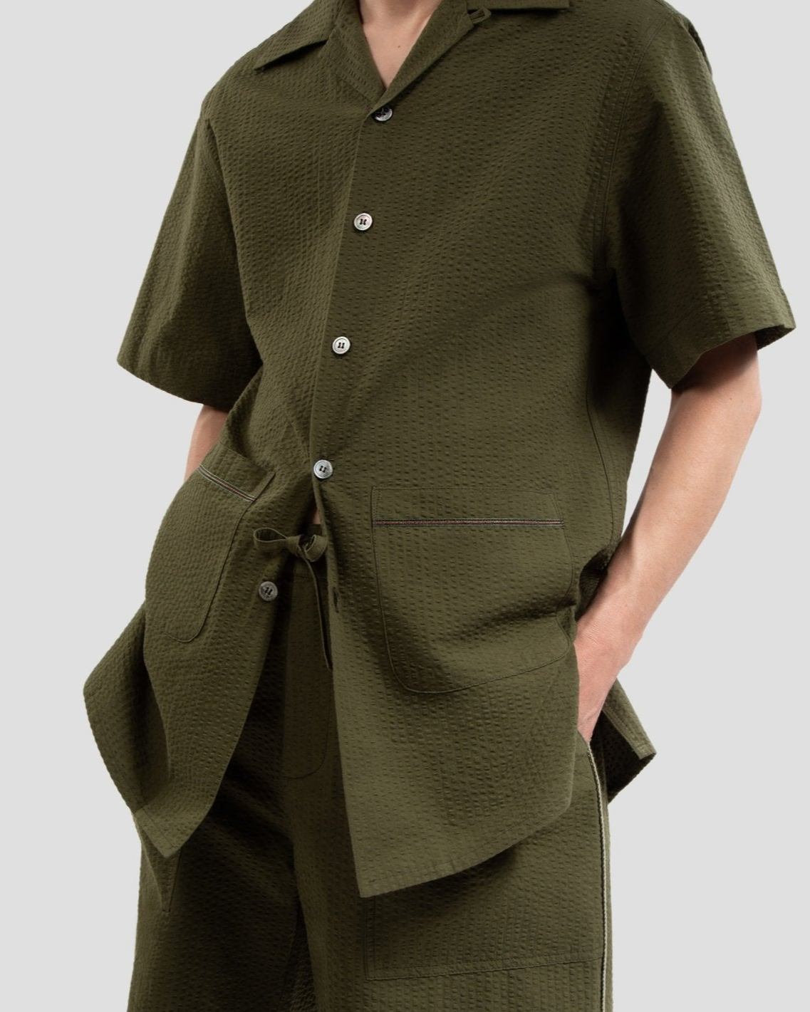 In Hindi, the native language of Northern India, the noun "Sair" means a leisurely walk.Staying true to the Wave Texture vision, we present our take on a vintage Hawaiian shirt, reimagined as an elegant Riviera essential. The silhouette has been reworked with wider sleeves to mimic the feel of a t-shirt, yet maintaining formality on hot summer days without compromising comfort.Crafted from 100% mid-weight Japanese seersucker cotton for optimal airflow, this shirt offers a retro-inspired, seamless facing embellished with mother of pearl buttons. Our minimalist approach to this timeless fabric is evident in our choice of a pure monotonal colour, free from the usual stripes. This is further enhanced by the inverted back pleat, creating a smooth, elegant wave and drape.The shirt’s side slits provide easy access to your waist pockets while enhancing airflow with their casual flare. The hems have a slight curve, completing the piece with a perfectly clean and sophisticated style. The cuban collar is tailored to achieve a look that balances heritage with a sleek modern touch.